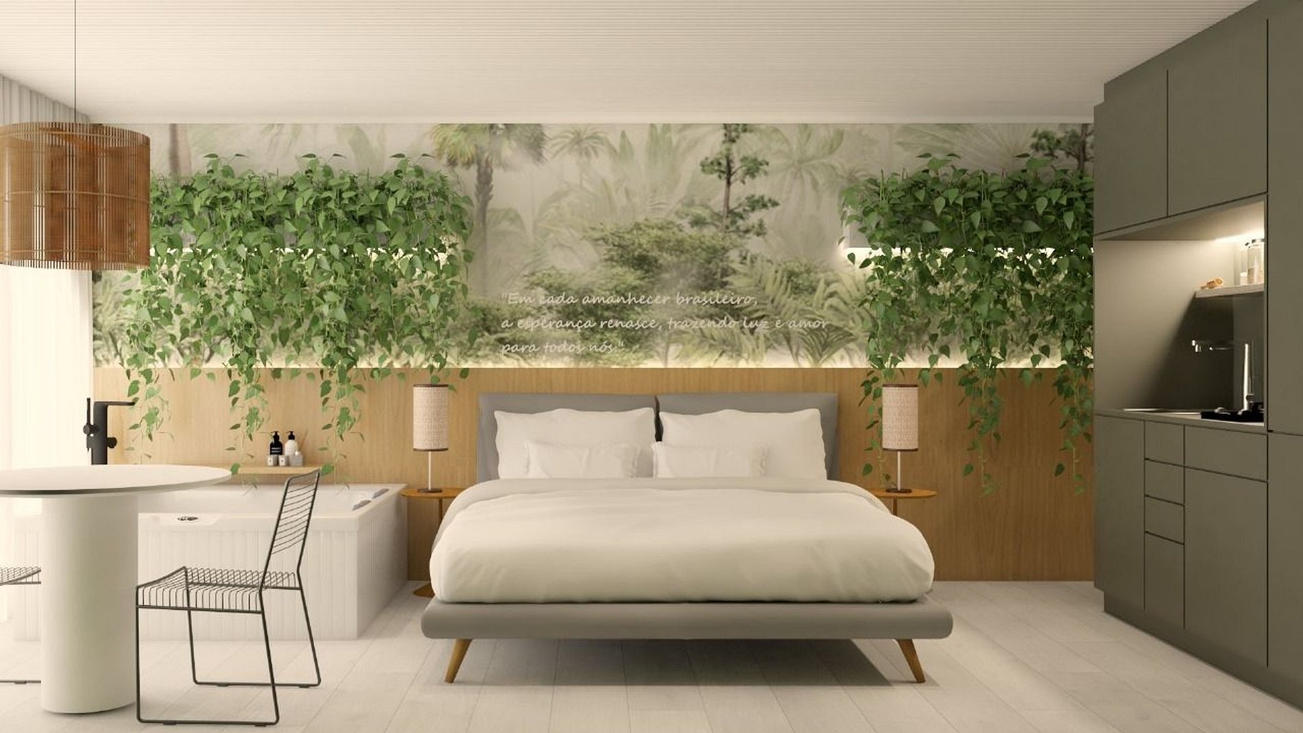 Inspirado nas cores e na energia do nosso país, a Cabana Sunset City Brasil foi pensado para transmitir alegria, aconchego e identidade cultural. As paredes ganham vida em tons que remetem à natureza exuberante — verde das florestas, azul dos rios e do céu, e detalhes em amarelo que iluminam o ambiente como o sol tropical.