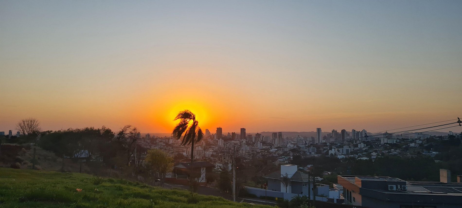 Do deck panorâmico, o pôr do sol se transforma em espetáculo exclusivo, iluminando a skyline da cidade enquanto as luzes urbanas começam a brilhar. O ambiente externo é emoldurado por palmeiras elegantes, estrategicamente plantadas para reforçar a atmosfera tropical e sofisticada do local.